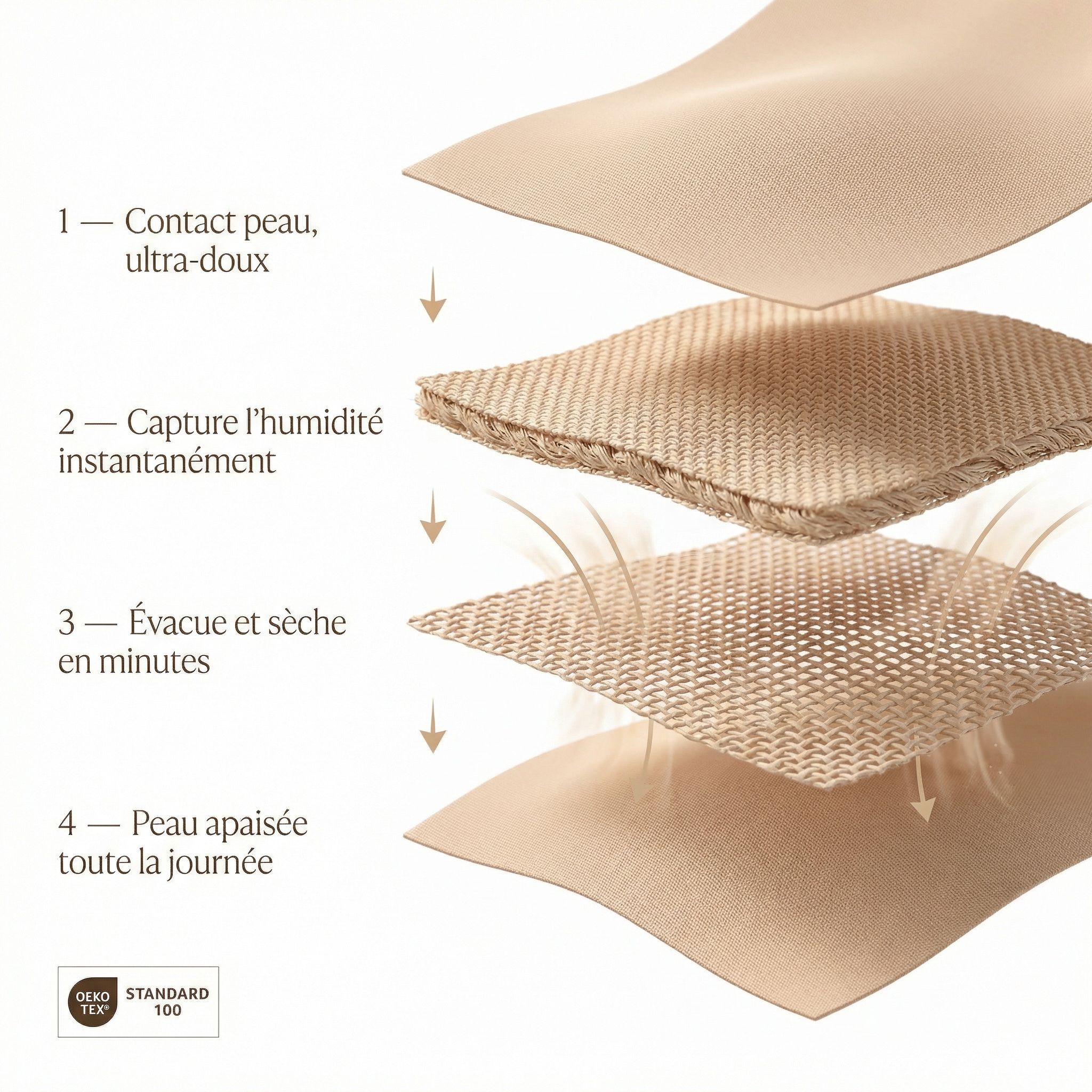 Certifié OEKO-TEX® — sans aucune substance nocive pour ta peau. Idéal pour les peaux sensibles et les femmes sujettes aux irritations.